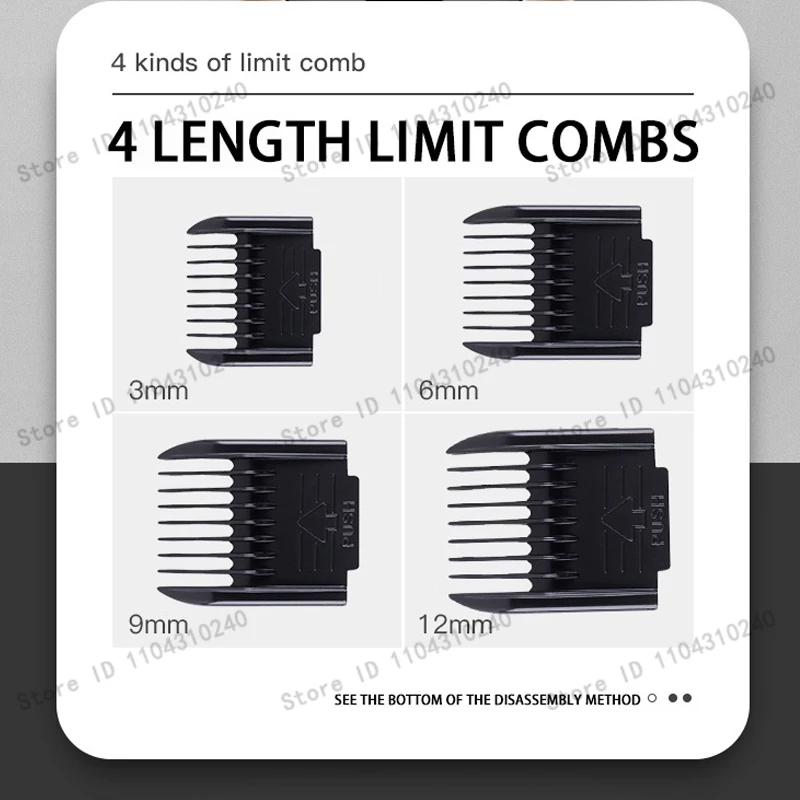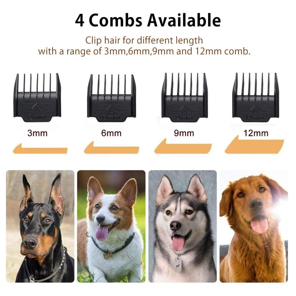 El set incluye 4 peines guía de diferentes longitudes (3mm, 6mm, 9mm y 12mm) que se colocan fácilmente en la cuchilla. Podrás elegir el largo perfecto para cada parte del cuerpo de tu mascota, desde un corte al ras hasta un acabado más largo y esponjoso.