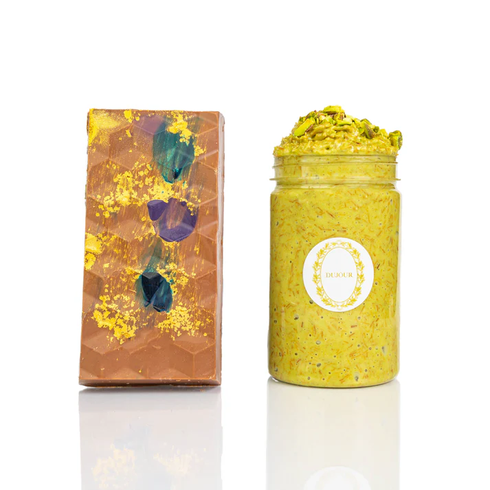Indulge in the ultimate dessert experience with our Pistachio Knafeh Chocolate Bar & Crunchy Spread Bundle, inspired by the rich, iconic flavors of Dubai. This luxurious set combines silky milk chocolate with a crunchy, nutty pistachio spread to give you a sweet moment you’ll want to relive again and again.